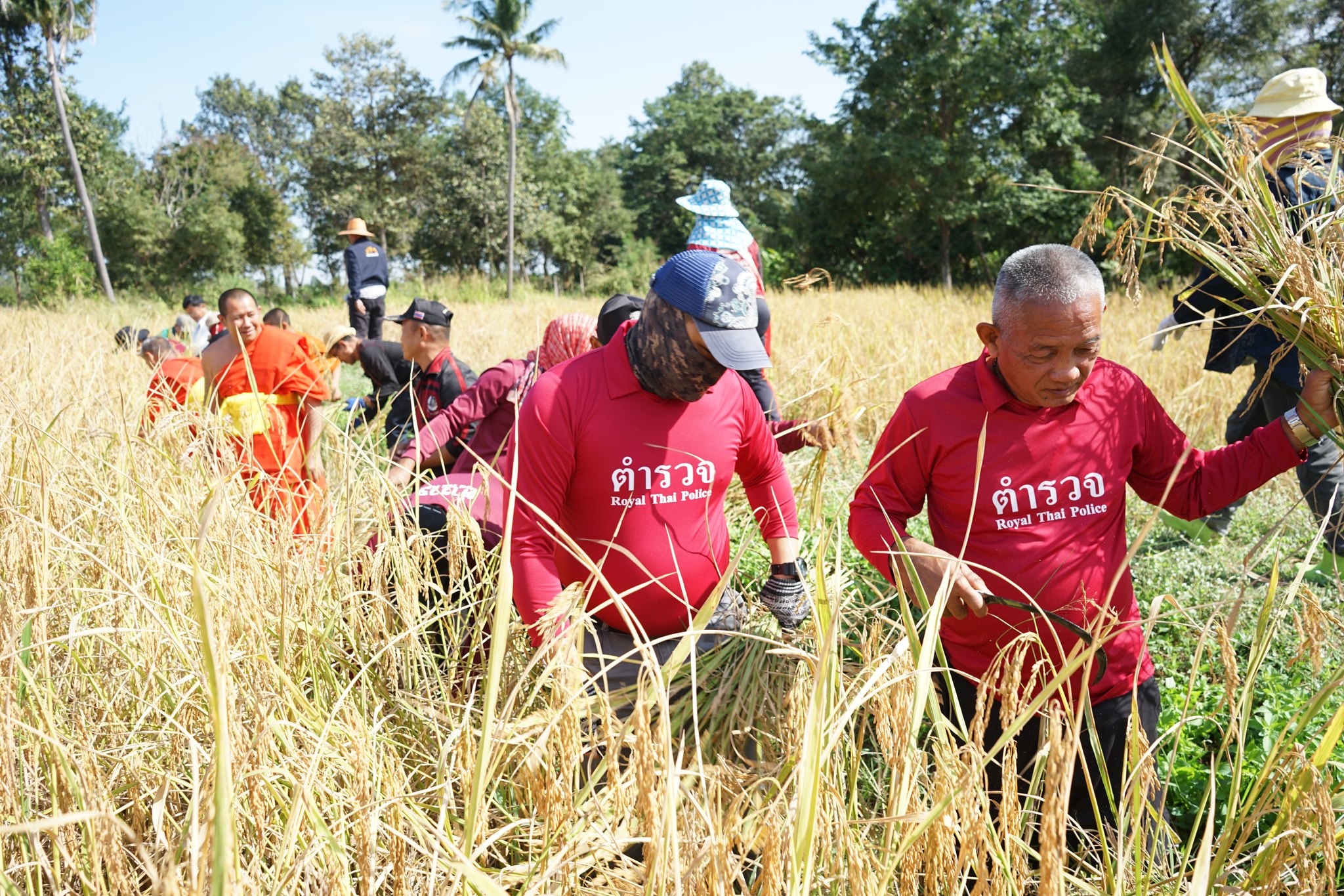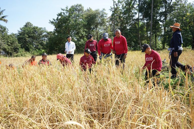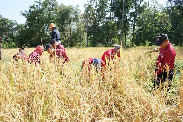 ข้าราชการตำรวจ สภ.จตุรพักตรพิมาน ร่วมสืบสานประเพณีวัฒนธรรมลงแขกเกี่ยวข้าว ณ วัดราชวารี ต.โคกล่าม