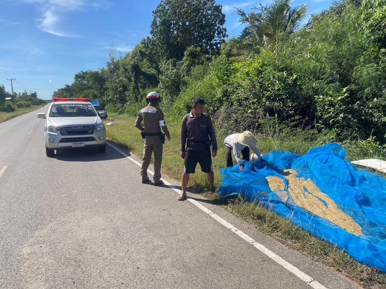 ร.ต.อ.วิทยา เหล่ายนขาม รอง สว.จร.สภ.จตุรพักตรพิมาน พร้อมชุดจราจรประชาสัมพันธ์การตากข้าวบริเวณถนนหลวง