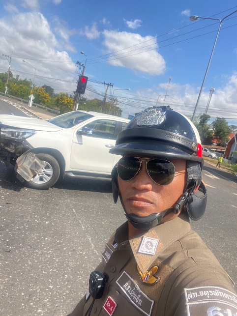 ด.ต.แอ๊ด นางสะอาด ผบ.หมู่ (ป.) ฯพร้อมชุดสายตรวจจราจร ให้ความช่วยเหลือผู้ประสบอุบัติเหตุ รถกระบะชนรถกระบะ